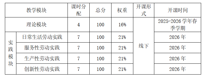 (二)根据专业人才培养方案设置要求,2025级全日制本科生每位学生必须完成1学分(32学时)的《劳动教育》课程。2025级全日制本科生课程须于2025-2026学年秋季学期完成排课、选课。《劳动教育》课程由教务处统筹规划,各学院具体组织实施。课程具体内容及形式如下: