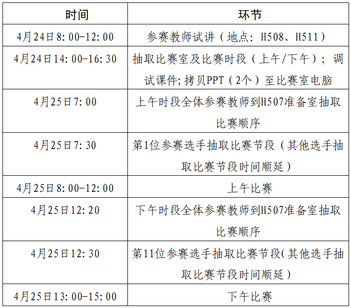 1.参赛教师须按日程准时参加各环节,迟到视为自动放弃。本人比赛开始前30分钟到准备室抽取具体授课节段。